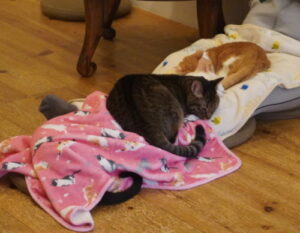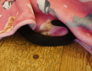 下半分は、ピンクのお膝掛けに潜ってるようです ![]()