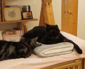 『本にゃんが乗ってるって言ってるから、お膝乗りでいいんじゃない