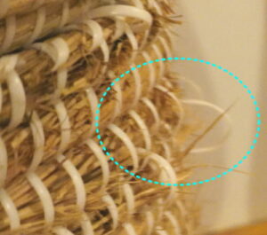 ワラが引っこ抜かれ、止め紐が引っ張られて、ボロボロ