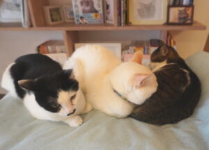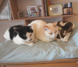 ケージの上で、ハンゾウくん&秀ちゃん&あーちゃんの猫団子