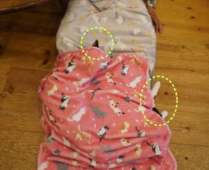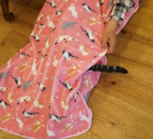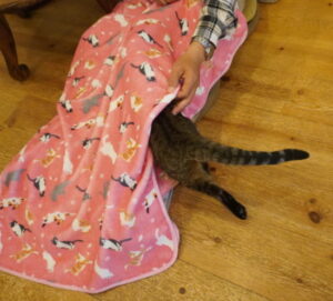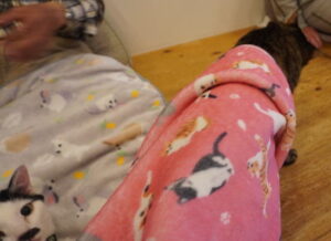 のワケはなく、ハンゾウくん&たろちゃんが、お膝掛けに潜っていました